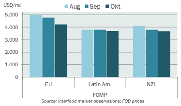 In line with the gradual decline in price for EU FCMP in the past few weeks there was quite some action from buyers in the last weeks of September. However, at the current price of EUR 3550-3650 ex works there is more sell side interest than the demand side can absorb. The cocoa prices have come off a little which generated some hope for better times for the chocolate industry but those buyers remain cautious in their procurement of ingredients. Atypically for this time of the year some processors have to produce FCMP that is not yet ordered. At the current price EU FCMP does not have access to the world market, but the gap with Latin America and New Zealand is closing.