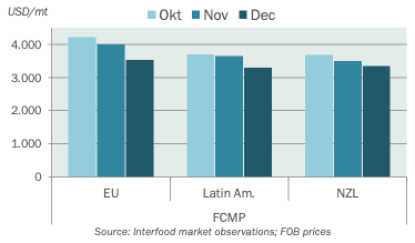 Prices in South America have dropped to USD 3300 FOB and downward pressure continues to build. Local demand remains weak and competition from the EU and New Zealand is mounting. Due to diminishing EU fat prices, European origins are competitive in the world market again and New Zealand FCMP prices are also coming down. The price drop since last month has been considerable but it does not feel like the market has seen the worst yet.