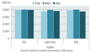 The FCMP market in Latin America feels quite balanced. Regional milk production is about 10% higher than it was this time last year, but demand is healthy as well, with Brazil buying decent volumes. The price has dropped a little, in order to remain competitive versus Oceania, to the current USD 3800-3850 FOB. At this level Latin America powder should also be able to service ONIL if and when they put out a tender. The Latin American buyside has increased the forward coverage and confirmations are now being negotiated for June delivery.