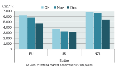 The butter price in APAC dropped by 18% since early November to USD 5400 FOB and it appears that there is further downward potential. Strong production of SMP results in a large supply of butter/AMF and the regional demand for butter is far from abundant. AMF demand in the APAC region, for NZ origin at least, is relatively lively, and this sustained the price for AMF to some extent. AMF is now available at USD 6100 FOB. The outlook for supply remains favorable and therefore the downward price ride may continue for a while longer.
