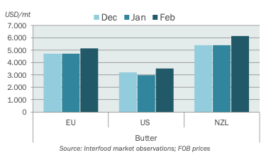 All during January the EU butter market was relatively quiet and relaxed. There was good availability and many suppliers had volumes on offer for nearby delivery. This changed when the EU SMP market caught fire early February. The sentiment in butter changed overnight and prices started to skyrocket. Most of the fundamentals remain unchanged though, with one important exception: EU butter exports are soaring now that the US market has tightened. Premium brands are in good demand for exports now. Buyers in the EU fear that they have missed the bottom price level and many of them are in a state of frenzy. It is almost impossible to quote a price level right now as it has been appreciating at such a high speed. In the second week of February the price appears to be settling around EUR 4200-4500 ex works.