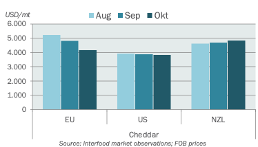 The EU cheese prices have all trended down in these past weeks, in accordance with the good availability of milk and the high fat content. This means that most of the EU cheese factories have been processing more milk than they had planned and that the availability of cheese is so good that buyers are comfortable to lean back. Mozzarella prices are about to fall below the EUR 3000 ex works threshold, but several sellers still resist. At this level the EU should win most of the export deals, but this will not offer relief very quickly. The price for Gouda is about EUR 3050 ex works both for Q4 and for Q1 delivery as everybody expects the supply to remain abundant for a little longer. The current price level appeals to a broad segment of the demand side as evidenced by quite good appetite to cover part of the requirements for Q1 and Q2. Cheddar prices, finally, have dropped to EUR 3500-3600 ex works for UK and Irish product, at which level there is much more on offer than on demand. Eastern EU cheddar changes hands at prices just below EUR 4000, but this market is quite locally oriented.