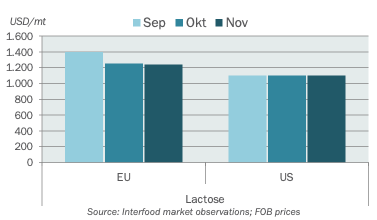 The US lactose market is stable at a price level around USD 0.50/lb (1100/t) ex works. Suppliers are sold out for Q4 so it seems and apart from some pockets of export demand in South America and Asia, market activity is diminishing.