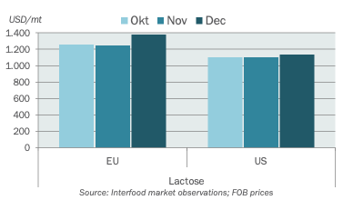 The US lactose market feels tight and is expected to remain tight for most of Q1. Volumes available for early next year do not seem to be sufficient for the demand that is still out there. Product is traded in the range of USD 0.48-0. 55/lb (1060-1215/t) ex works, but it feels like we may go soon above these levels.