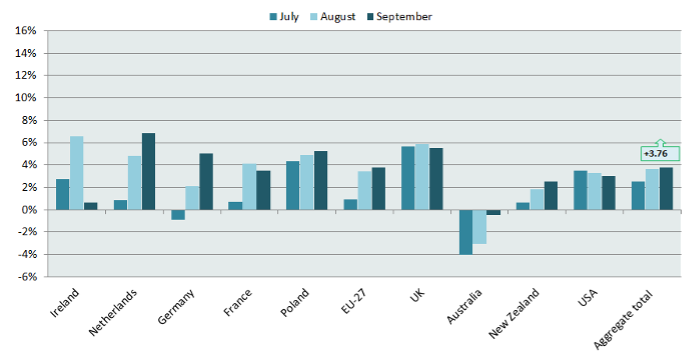 The Oceania season continues to unfold favorably for most farmers. Physical soil conditions are good and prices at GDT do not give enough arguments to change the seasonal milk price outlook from its current high level. Australia supply continues to hover a few percent below last year, which adds fuel to the fire of companies competing for milk. NZ milk production on the other hand is expected to sustain its higher output levels throughout the current peak period.