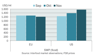 Market conditions in US SWP have not changed too much since last month, be it that the tight supply conditions continue to push prices to higher levels. SWP currently changes hands at USD 0.70–0.72/lb (1545-1585/t) ex works. WPC-80 supply is extremely tight and prices have even closed the gap with EU price levels. Not too long ago we saw US product ending up in the EU, but today the market appears to be approaching the point that we may see product going the other way.