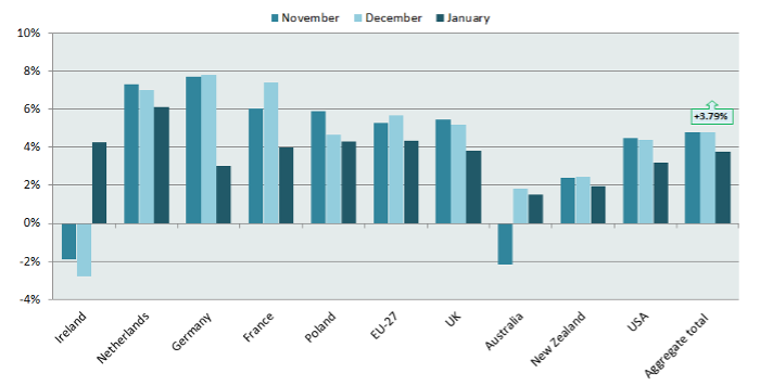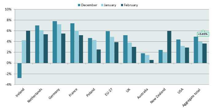 The US continues to report strong milk production and high content levels. Production was 3.2% up year on year in January and signs of herd reductions are as yet absent. It has to be noted though that heifer replacement is low. This implies that milk production needs the fuel of low feed prices driving cow productivity. Another source of sustained growth will be that the average age of cows increases as they are kept for more lactations than usual.