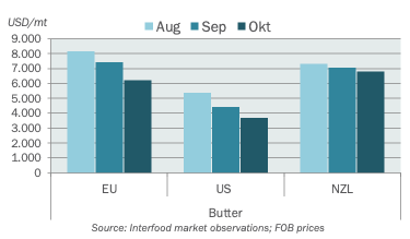 In APAC the butter price drop has been modest compared to the US and the EU. This is largely because of the strength of the demand in China, where branded butter continues to be sold at a premium. Because of China’s dominance in the early October GDT session the price dropped no further than USD 6800 FOB, a decline of 3.5% versus the September Market Watch. The price spread with AMF is beginning to normalize because of its relatively low availability. The AMF spot price is now USD 7150 FOB, which is 2.1% higher than our early September quote.