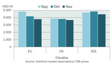 Prices of both colored and white cheddar came down since last month but the market still feels overall balanced. There seems to be some anticipation that the market may loosen up when we get passed the current wave of seasonal demand though. Buyers seem unwilling to commit to too high volumes for 2026 yet, which seems to be indicative of the mindset of the demand side of the market. US cheese is still moving into export markets but with EU Cheddar prices rapidly dropping it is no longer an easy ride. The price of colored cheddar is around USD 1.65/lb (3640/t), which is somewhat lower than white cheddar where the price range is in the high USD 1.60-ies (3700/t) both prices ex works.