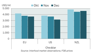 The EU cheese market was quite lively these past few weeks. By now most of the buyers have covered their needs well into Q1 but most sellers still have a little more cheese in their hands than they would have liked to. Cheese in general still enjoys good valorization in the dairy complex and this creates further pressure on the cheese price levels going forward. Mozzarella producers have product on offer at EUR 2800-2850 ex works for December and Q1 but struggle to find a buyer. With Q2 futures at about EUR 2900 the buyside can afford to wait. US and EU mozzarella compete on the export markets and South Korea is eager to benefit. The price range for Gouda depends on the origin but the average is EUR 2850-2950 ex works, i.e. similar to our early November quote. The buyside is covered for the most part of Q1 and there is still volume to be sold. On the Cheddar market EU exporters compete with US product. Eastern EU producers are in the market at EUR 3300-3400 ex works but the pressure to sell is much higher than in November. The sell side is more relaxed in the UK and Ireland at the price range of EUR 3000-3150, with the UK on the low end of the range and Ireland at the high end.