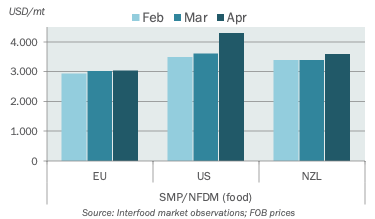Relatively low production of NFDM/SMP continues to push the local price levels upward. There is surprisingly strong demand both within the US and from Mexico and it feels like buyers have decided to bite the bullet to increase their forward coverage. At the current level of about USD 1.95/lb (4300/t) ex works prices appear to stabilize. However, suppliers that have the opportunity to sell within the next two weeks can easily earn USD 2.02-2.05/lb. The futures market is backwardated, with Q3 levels around USD 1.55/lb. We repeat our statement that the sell side does still not concur with the looser outlook and largely refrains from offering at these forward delivery dates.